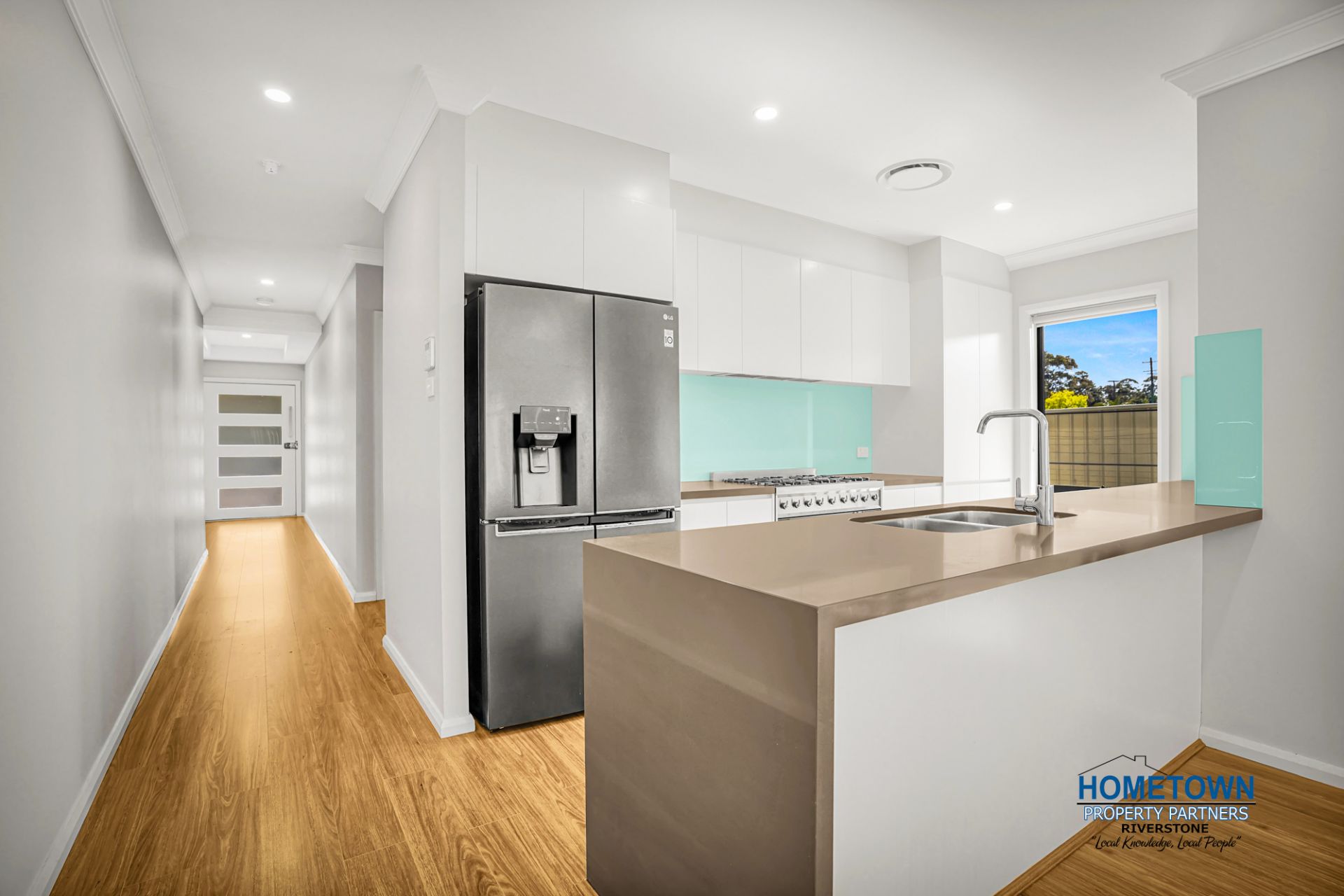 * Kitchen with 40mm stone waterfall bench tops
